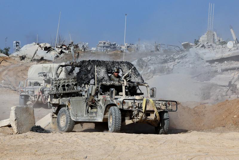 03.10.2025, Gaza City (PAP/EPA) - A photo taken while embedded with the Israeli Army and cleared by Israeli military censors shows Israeli army soldiers riding military vehicles in front of war-destroyed buildings in the vicinity of the Jordanian Field Hospital in Gaza City, 03 October 2025 (issued 04 October 2025). Israel's military said on 04 October to advance readiness for the implementation of the first phase of the Trump plan for the release of the hostages while the same time make the safety of IDF troops a top priority and allocate all IDF capabilities to the Southern Command to ensure the protection of the troops. --PHOTO TAKEN DURING A CONTROLLED TOUR AND SUBSEQUENTLY EDITED UNDER THE SUPERVISION OF THE ISRAELI MILITARY-- (fot. Jack Guez/Pool)