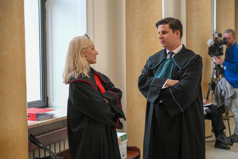 06.10.2025, Warszawa (PAP) - Pełnomocnik Wołodymyra Z. mec. Tymoteusz Paprocki (P) przed salą Sądu Okręgowego w Warszawie, 6 bm. Trwa posiedzenie aresztowe ws. poszukiwanego europejskim nakazem aresztowania, wydanym przez Federalny Trybunał Sprawiedliwości w Karlsruhe obywatela Ukrainy Wołodymyra Z., który miał wysadzić gazociąg Nord Stream. (fot. Marcin Obara)