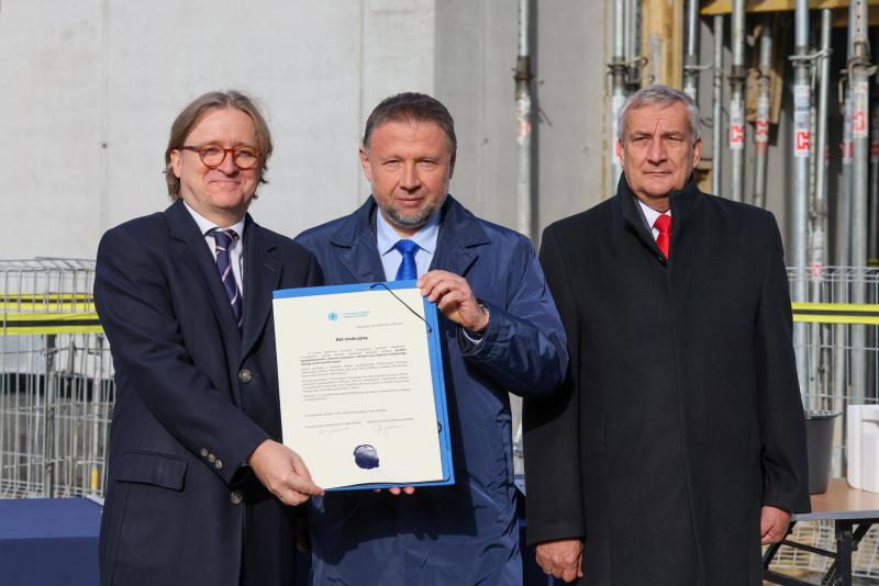 06.10.2025, Warszawa (PAP) - Minister spraw wewnętrznych i administracji Marcin Kierwiński (C), wiceminister spraw wewnętrznych i administracji Wiesław Szczepański (P) i dyrektor PIM MSWiA, prof. dr hab. n. med. Piotr Suwalski (L) po podpisaniu aktu erekcyjnego w Państwowym Instytucie Medycznym MSWiA w Warszawie, 6 bm. Wydarzenie jest związane z rozbudową Państwowego Instytutu Medycznego MSWiA przy ul. Wołoskiej. (fot. Paweł Supernak)