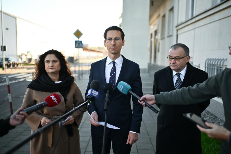 13.10.2025, Gdynia (PAP) - Posłowie PiS Dorota Arciszewska-Mielewczyk (L), Kacper Płażyński (C) i radny Gdańska Piotr Koenig (P) podczas konferencji prasowej przed siedzibą Zarządu Morskiego Portu Gdynia, 13 bm. Temat spotkania: wyniki analizy dokumentów dotyczących wygranego przez spółkę Stena Line przetargu na użytkowanie terminalu promowego w Gdyni. (fot. Adam Warżawa)
