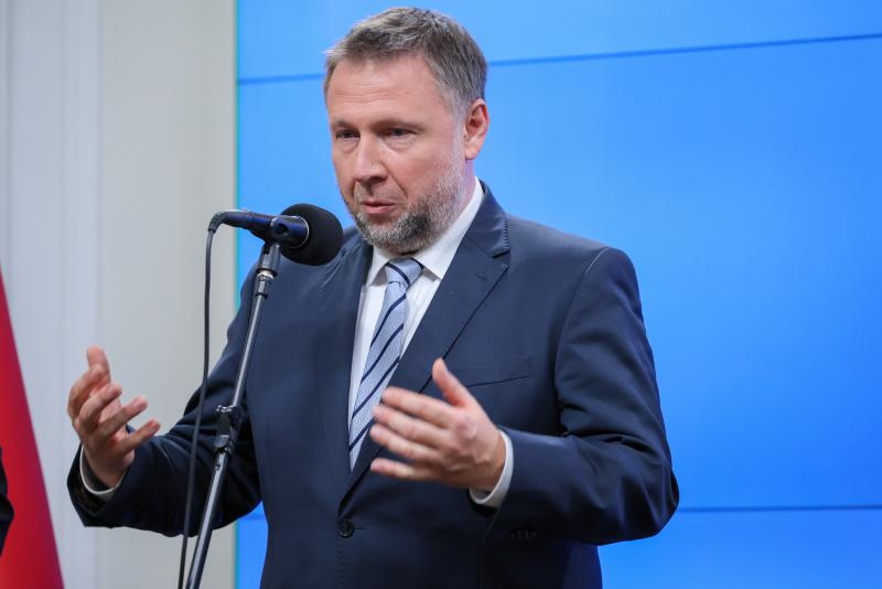 09.10.2025, Warszawa (PAP) - Minister spraw wewnętrznych i administracji Marcin Kierwiński podczas konferencji prasowej dot. zbiornika Kamień Ząbkowicki, 9 bm. w siedzibie Ministerstwa Infrastruktury w Warszawie. (fot. Rafał Guz)