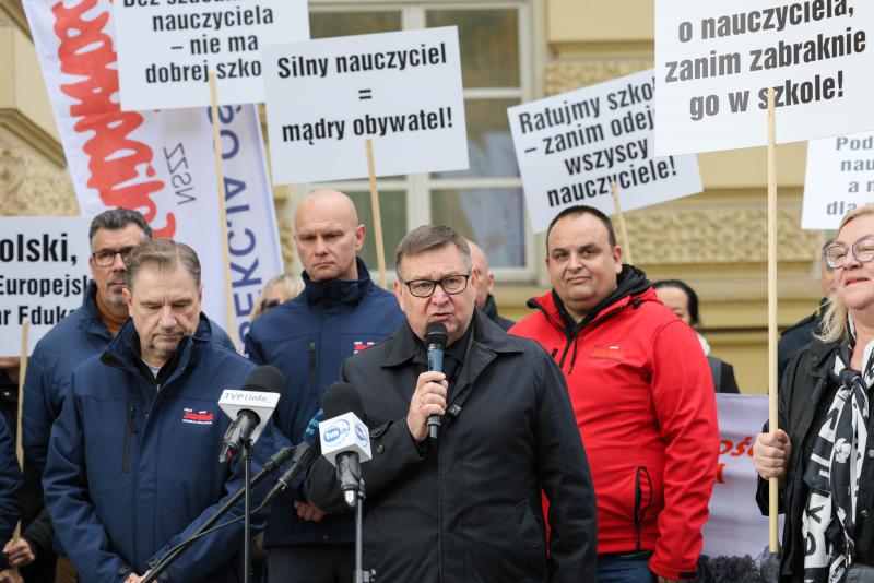 14.10.2025, Warszawa (PAP) - W Dniu Nauczyciela oświatowa "Solidarność" protestowała przed KPRM przeciwko polityce oświatowej rządu. - Nie mamy czego świętować. Dialog społeczny utknął - powiedział jej przewodniczący Waldemar Jakubowski. Rzecznik rządu Adam Szłapka zapewnił, że dialog będzie się odbywał.Przedstawiciele "Solidarności" wyjaśnili, że protest przed kancelarią premiera zorganizowali w związku z "niewypełnieniem postulatów nauczycieli oraz brakiem realnego dialogu z rządem".We wtorek mieli ze sobą transparenty z hasłami: "Stabilna szkoła = silna Polska", "Ratujmy szkołę - zanim odejdą wszyscy nauczyciele!" czy "Zadbaj o nauczyciela, zanim zabraknie go w szkole!".Przewodniczący Krajowej Sekcji Oświaty i Wychowania Niezależnego Samorządnego Związku Zawodowego "Solidarność" Waldemar Jakubowski zapytany przez PAP, dlaczego związkowcy protestują w Dniu Nauczyciela, odparł: - Nie mamy czego świętować. Dialog społeczny utknął.Wyjaśnił, że związkowcy oczekują przede wszystkim powiązania wynagrodzeń nauczycieli z przeciętnym wynagrodzeniem w sektorze przedsiębiorstw. - To mogłoby też przyciągnąć młodych ludzi. Mamy kryzys, w systemie oświatowym nie ma młodych. Nie mamy zastępowalności pokoleń - argumentował.Związkowcy chcą też "zmiany narracji, jeśli chodzi o nauczycieli". Jakubowski dodał, że "podzielono uczniów, nauczycieli i rodziców na osobne grupy", choć "powinny współpracować we własnym interesie, rozumiejąc, że cel edukacyjny jest celem wspólnym".Jak dodał, wszystkie rozwiązania już wcześniej ministerstwo edukacji "dostało na talerzu", jednak do tej pory "nic z nimi nie zrobiło". - Dlatego nie jesteśmy przed Ministerstwem Edukacji Narodowej. Z panią minister (edukacji, Barbarą Nowacką - PAP) nie mamy o czym rozmawiać. Co mieliśmy do powiedzenia, powiedzieliśmy. Teraz decyzja jest po stronie premiera - zaznaczył."Brak dialogu" Jakubowski tłumaczył w swojej ocenie "dużą niechęcią przed przeprowadzeniem zmian". - Z jednej strony obserwuję, powiedziałbym, brak kompetencji wśród wielu urzędników, najwyższych urzędników Ministerstwa Edukacji Narodowej, ale także brak woli politycznej - powiedział.Przyznał, że niektóre rozwiązania, jak np. określenie stałej kwoty na wydatki edukacyjne, nie są rozwiązaniami łatwymi. - Ale trzeba to zrobić. Skoro mógł to zrobić Cypr, czy Grecja (...) i wiele innych krajów, dlaczego Polska nie może tego zrobić? - dodał.Związkowcy złożyli w KPRM petycję do rządu zawierającą postulaty środowiska nauczycieli. Jakubowski przekazał, że poruszono w niej kwestie, "które bolą", m.in. sprawę obywatelskiego projektu ustawy dotyczącego wynagrodzeń, "dyskryminujące przepisy" dotyczące godzin nadliczbowych i ponadwymiarowych, czy kwestię urlopu na żądanie, którego "nauczyciele, jako jedyna grupa zawodowa w Polsce, są pozbawieni".Przewodniczący Komisji Krajowej NSZZ "Solidarność" Piotr Duda w rozmowie z PAP przekazał, że związkowcy dostrzegają, że muszą "zewrzeć szyki i wspólnie zorganizować jakieś akcje, nie dzieląc się na poszczególne zawody, branże". - Jeżeli uda nam się wypracować to jedno słowo, o które nam chodzi, którego dzisiaj brakuje w naszym kraju, czyli "dialog", to sytuacja powinna iść w dobrym kierunku, bo dialog rozwiąże nam wszystkie problemy - powiedział.Jak dodał, "niekoniecznie wszyscy z tego dialogu będą zadowoleni, bo przecież na tym polega kompromis, że nie wszyscy od stołu wychodzą przeszczęśliwi lub zadowoleni". - Ale my dzisiaj nawet tej możliwości nie mamy - zaznaczył.Zapytany, co dalej, jeśli w rozumieniu "Solidarności" dialogu mimo wszystko nie będzie, Duda odparł: - Mamy różne warianty, które będziemy starali się przygotować. Dodał, że tym przygotowaniom mają służyć październikowe spotkania.Do zarzutów związkowców o braku dialogu odniósł się podczas wtorkowej konferencji rzecznik rządu Adam Szłapka. - Rozmawiałem dzisiaj z panią minister Nowacką i wiem, że ten dialog będzie się odbywał i na pewno w najbliższym czasie dojedzie do rozmowy - zapewnił. (PAP)pak/ agz/ Zamieszczone na stronach internetowych portalu Stooq materiały sygnowane skrótem "PAP" stanowią element Serwisu Informacyjnego PAP, będącego bazą danych, którego producentem i wydawcą jest Polska Agencja Prasowa SA z siedzibą w Warszawie. Chronione są one przepisami ustawy z dnia 4 lutego 1994 r. o prawie autorskim i prawach pokrewnych oraz ustawy z dnia 27 lipca 2001 r. o ochronie baz danych. Powyższe materiały wykorzystywane są przez Stooq na podstawie stosownej umowy licencyjnej. Jakiekolwiek ich wykorzystywanie przez użytkowników portalu, poza przewidzianymi przez przepisy prawa wyjątkami, w szczególności dozwolonym użytkiem osobistym, jest zabronione.
