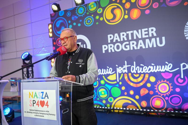 16.10.2025, Warszawa (PAP) - Prezes Fundacji Wielkiej Orkiestry Świątecznej Pomocy Jerzy Owsiak podczas dziewiątego ogólnopolskiego bicia rekordu w pierwszej pomocy, 16 bm. w Szkole Podstawowej nr 404 im. Wielkiej Orkiestry Świątecznej Pomocy w Warszawie, w ramach Europejskiego Dnia Przywracania Czynności Serca. Fundacja WOŚP od 19 lat uczy dzieci pierwszej pomocy w ramach Programu Edukacyjnego "Ratujemy i Uczymy Ratować". W ramach wydarzenia oficjalnie zainicjowano także zgłoszenia Sztabów na 34. Finał WOŚP. (fot. Marcin Obara)