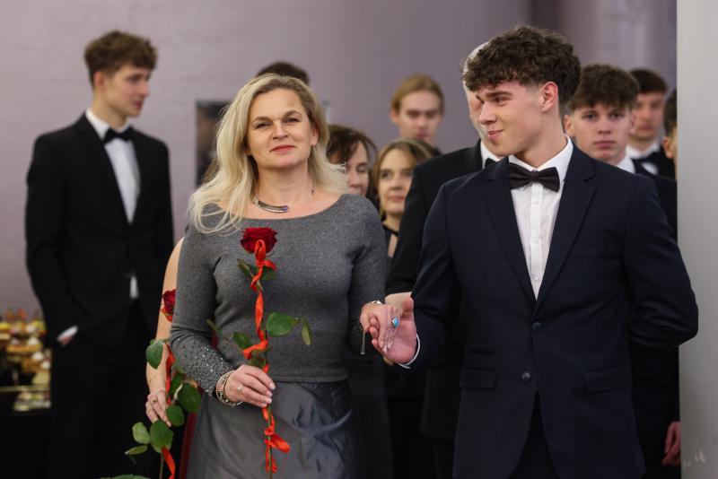 17.01.2026, Rąbień (PAP) - Minister edukacji Barbara Nowacka (L) oraz maturzysta Antoni Łuczak (P) podczas balu studniówkowego łódzkiego XXXII LO, 17 bm. w miejscowości Rąbień. (fot. Marian Zubrzycki)
